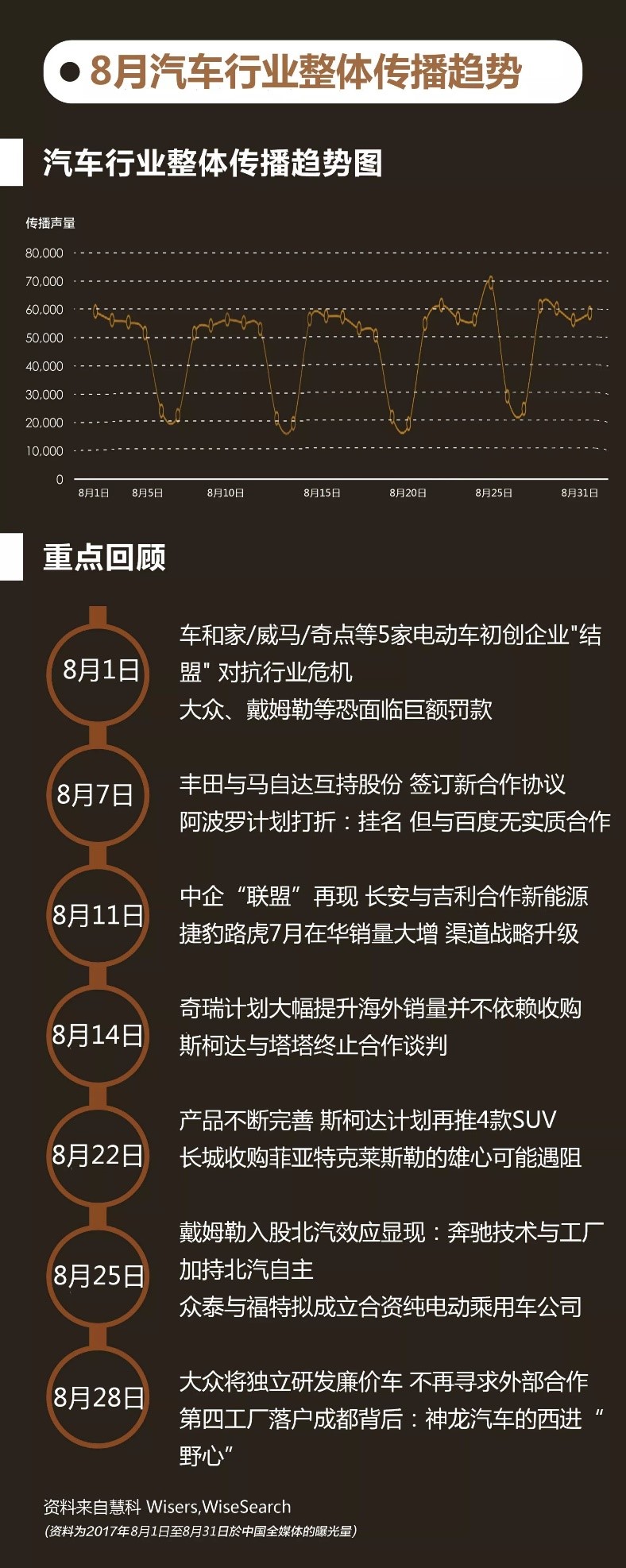 其中在8月25日,汽车行业新闻以64878篇的传播量达到峰值,主要传播内容为“戴姆勒入股北汽效应显现:奔驰技术与工厂加持北汽自主”“众泰与福特拟成立合资纯电动乘用车公司”等。
