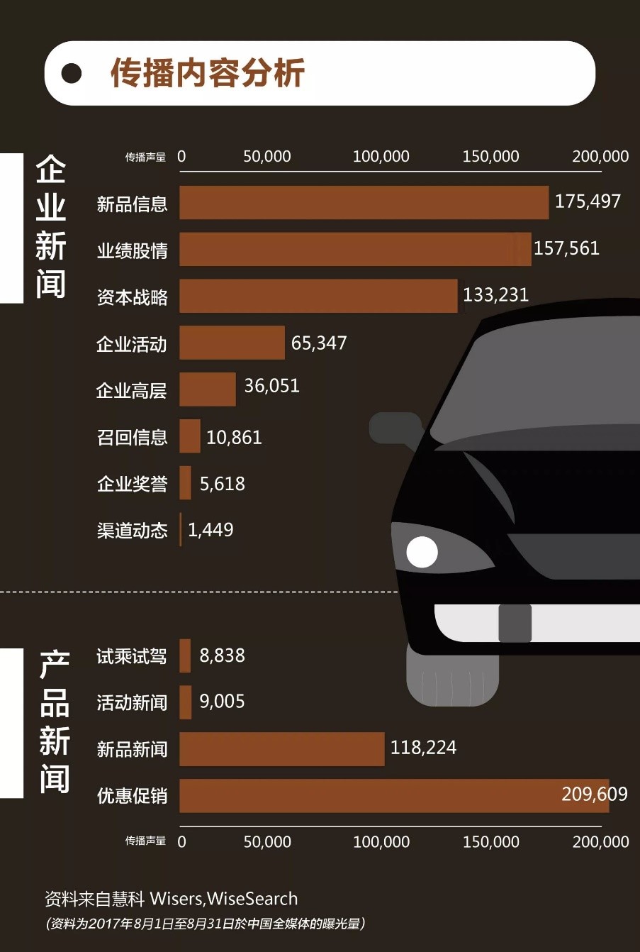 本月企业信息传播内容主要以新品信息、业绩股情、资本战略等传播内容为主,产品新闻传播内容则以优惠促销、新品新闻为主,并辅以试乘试驾、活动新闻推广等。
