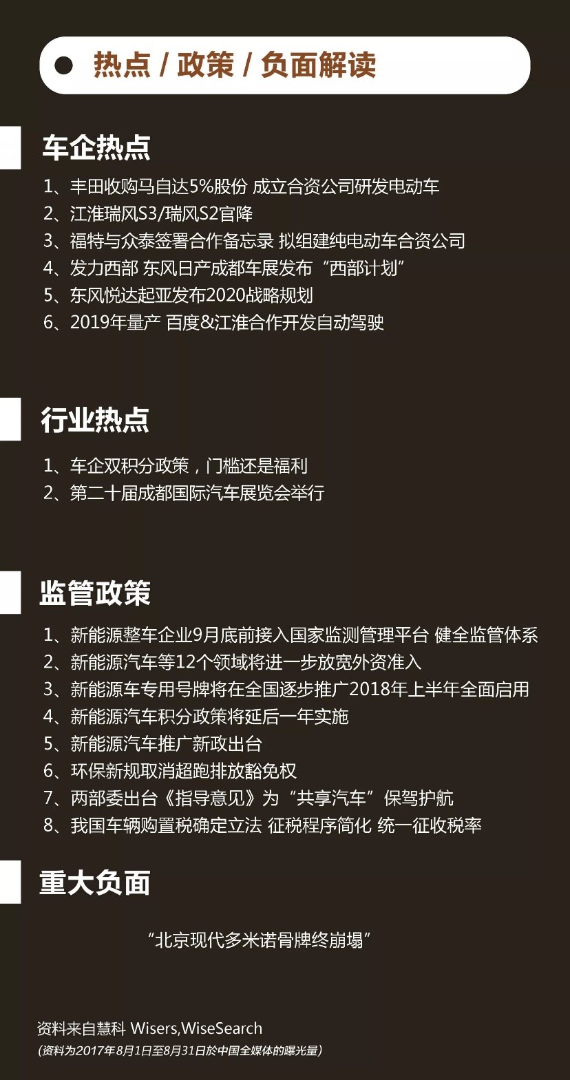 本文内容部分来源自慧科讯业有限公司汽车行业月度分析报告,以慧科讯业全媒体数据库平台媒体监测结果为研究基础,分析对象系媒体公开报道之信息数据库,其来源准确有效;但结论仅供参考,不作为投资意见。