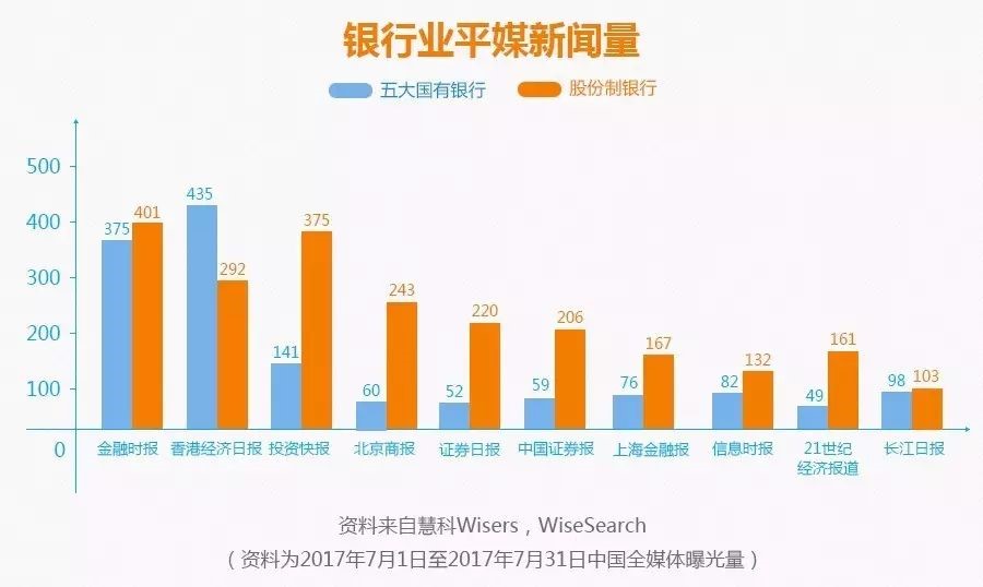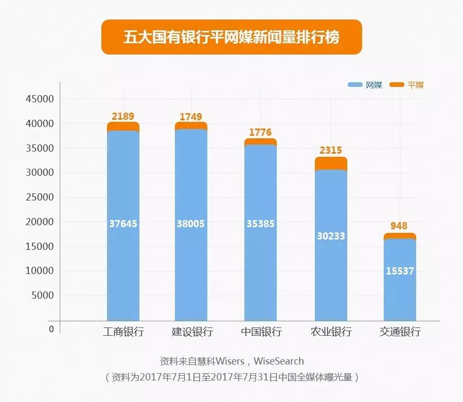 2017年7月慧科全媒体大数据平台监测到五大国有银行新闻有165782条,占银行业新闻监测总量的26.08%。五大国有银行中,工商银行的新闻总量最多,包括了2189篇平媒新闻与37645篇网媒新闻,建设银行排名第二,交通银行的新闻总量最少。以下为详细数据: