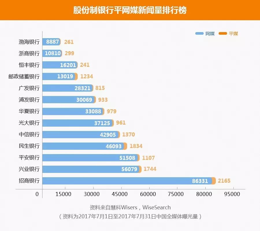 股份制银行新闻有469798条,占比为73.92%,较上月比例上升。其中招商银行的新闻总量最多,包括2165条平媒新闻和86331条网媒新闻;兴业银行和中平安银行的新闻总量分列二、三位,渤海银行新闻总量最少。以下为详细数据: