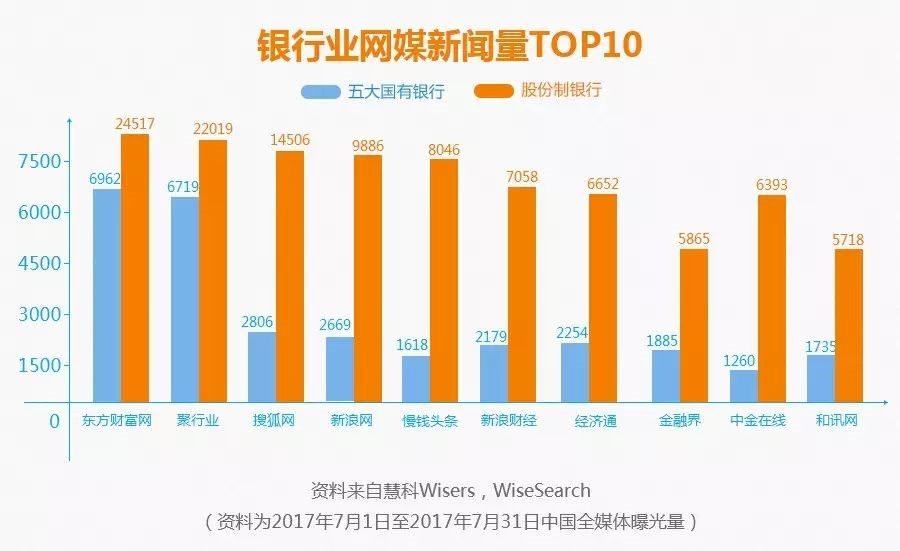 本月银行业新闻量排名前十的网媒中,东方财富网的报道量最多,相关报道31479篇,聚行业及搜狐网排名第二和第三。从银行类型来看,前十家网媒关于股份制银行的新闻量多于五大国有银行。从报道内容来看,媒体的关注点主要集中在银行信贷和房贷利率等方面。