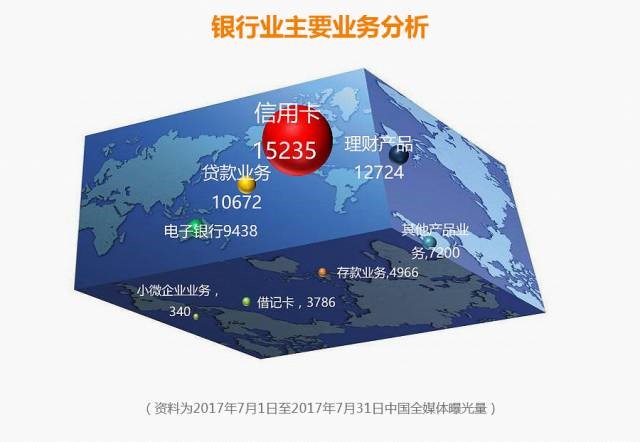 本月银行业各项主要业务的新闻当中,排名前列的包括:信用卡、理财产品、贷款业务和电子银行。