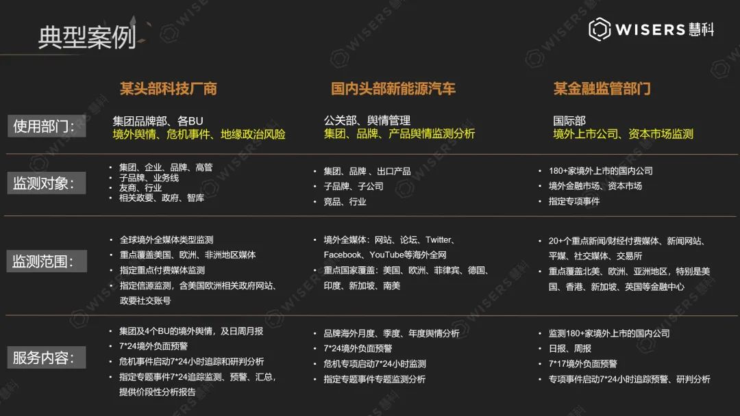 ● 商业价值输出:服务方面包括预警、危机期间响应和追踪、分析报告等,满足出海企业需求。