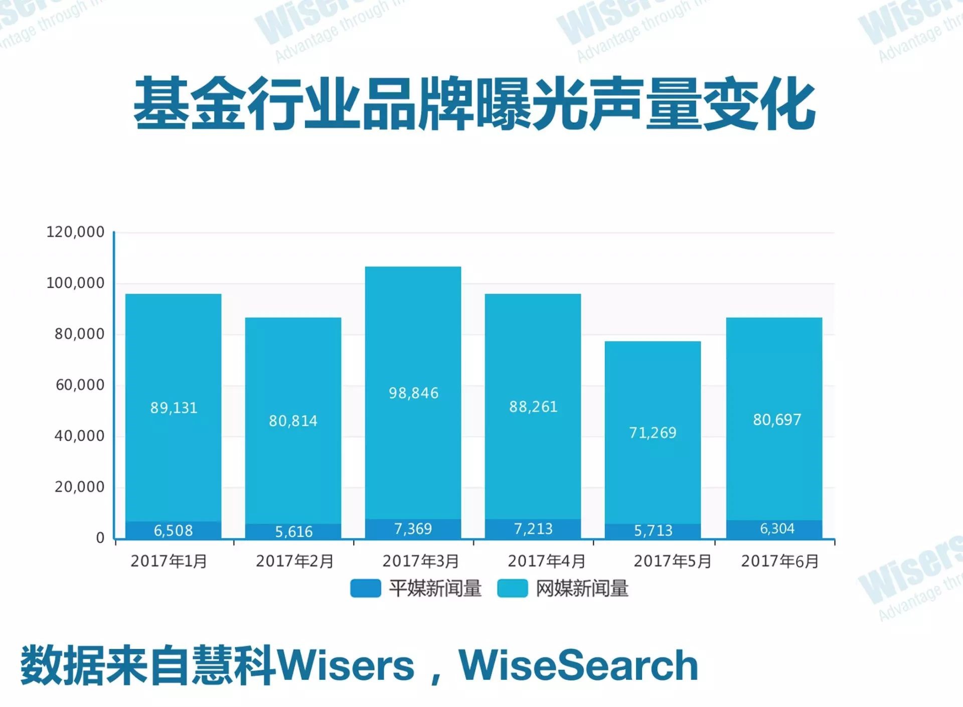 2017年6月基金行业新闻曝光量为80771篇,总体呈上升趋势。本月总体新闻量环比上升13.0%;其中,平媒新闻量环比上升10.3%,网媒新闻量环比上升13.2%。