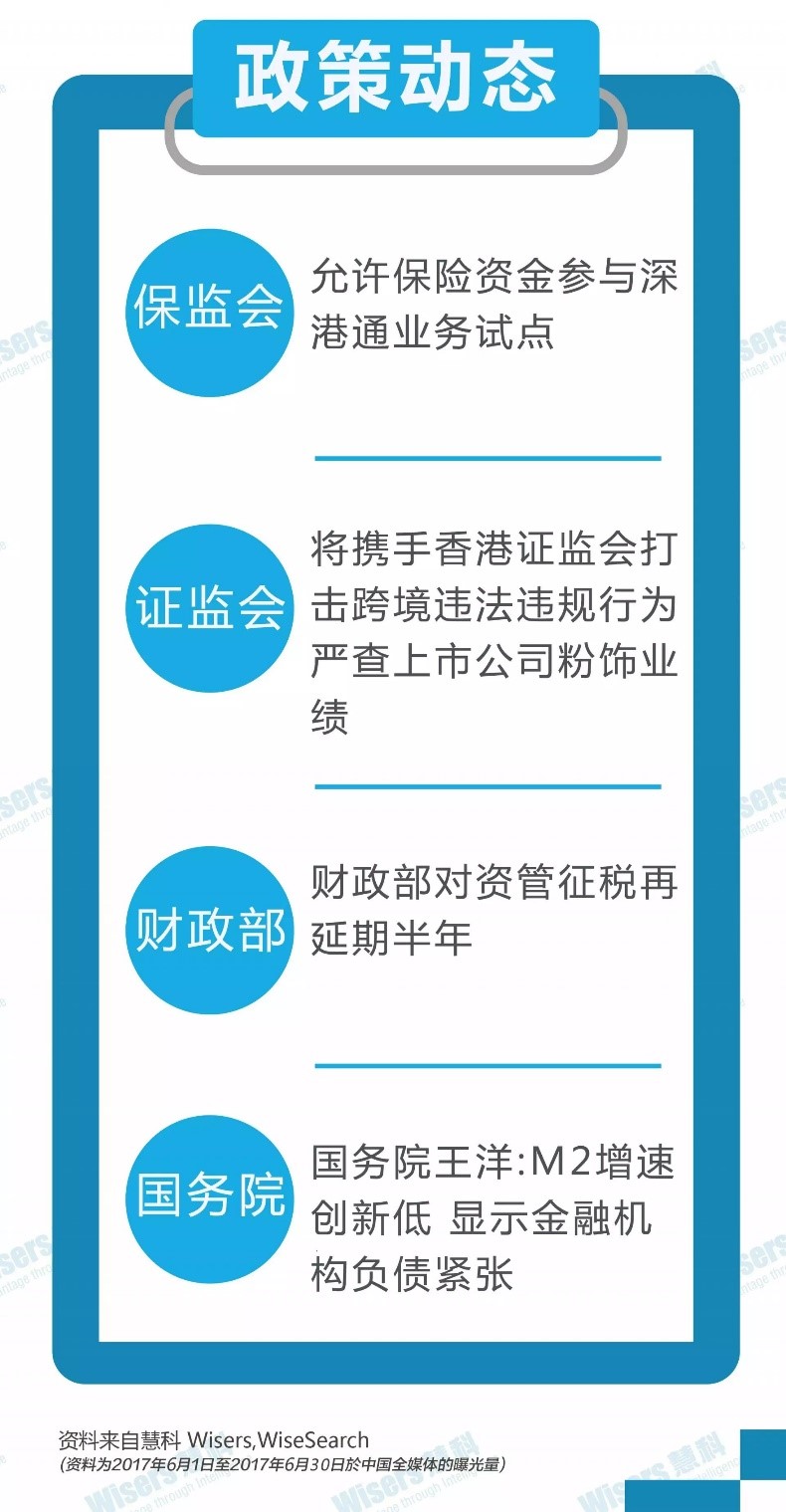 6月份证监会严查上市公司粉饰业绩,IPO通过率进一步下降;针对A股纳入MSCI,证监会宣布将携手香港证监会联合打击跨境违法违规。保监会允许险资参与深港通业务、财政部对资管征税再延期都是对市场的呵护。