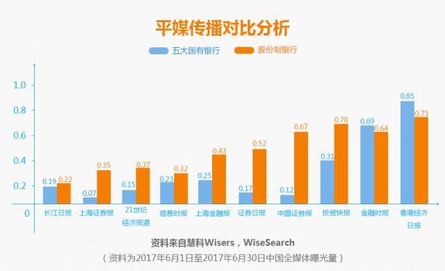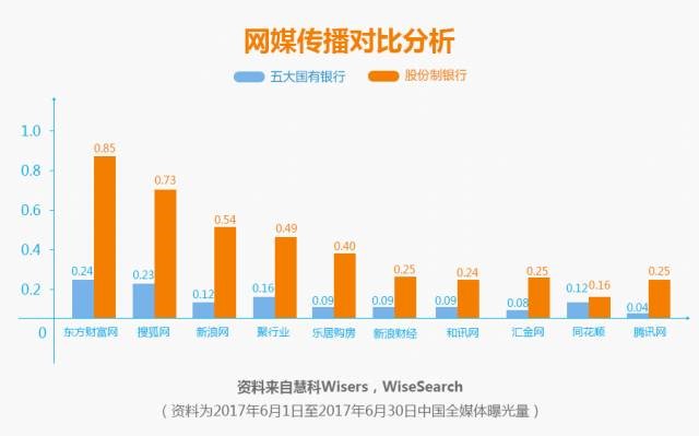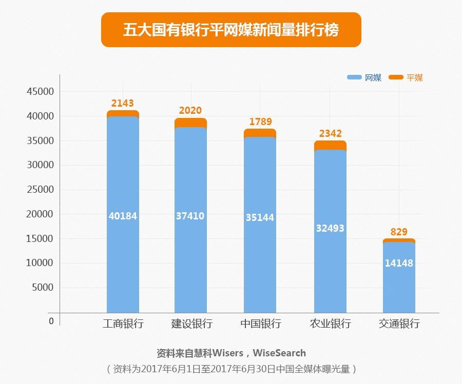 2017年6月慧科大数据平台监测到五大国有银行新闻有168502条,占银行业新闻监测总量的28.74%,其中工商银行的新闻总量最多,包括了2143篇平媒新闻与40184篇网媒新闻;建设银行排名第二,交通银行的新闻总量最少。国有银行新闻内容主要为各个银行的业务合作相关报道。