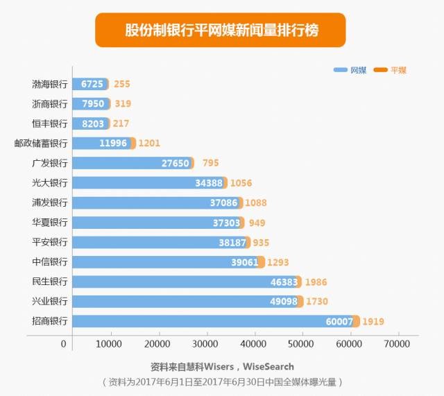 股份制银行新闻有417780条,占比为71.26%。招商银行的新闻总量最多,包括1919条平媒新闻和60007条网媒新闻;兴业银行和中信银行的新闻总量分列二、三位,渤海银行新闻总量最少。