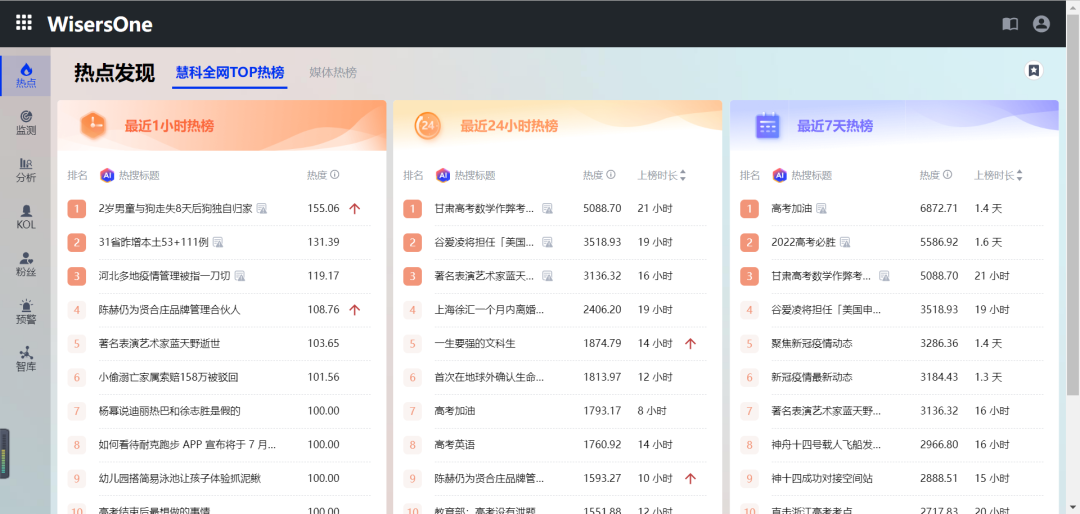 通过不同时间段的监测,可以获取当下网络中热点时事,帮助企业提供科学化决策,及时响应关联热点,提升品牌声量。从而引起用户关注。