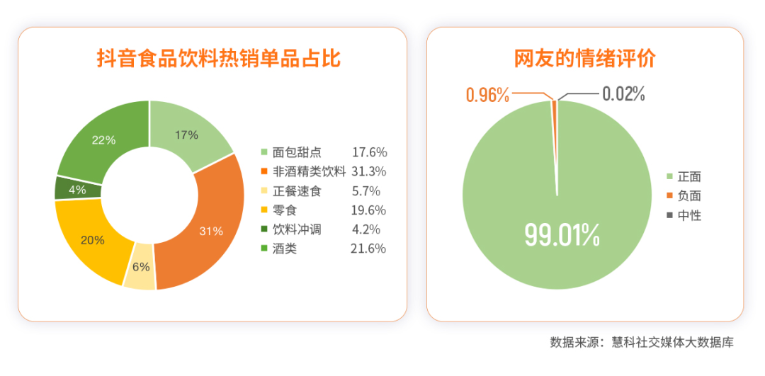 相比于文字、图片、长视频等传统形式,短视频具有表达能力更强、创作门槛低、互动和社交属性更强等多重特征,可以更加直观、立体地满足用户间展示、分享及互动的诉求,我们由此进入读秒时代。尤其是抖音中的食品饮料占据着重要地位和不小的市场份额。