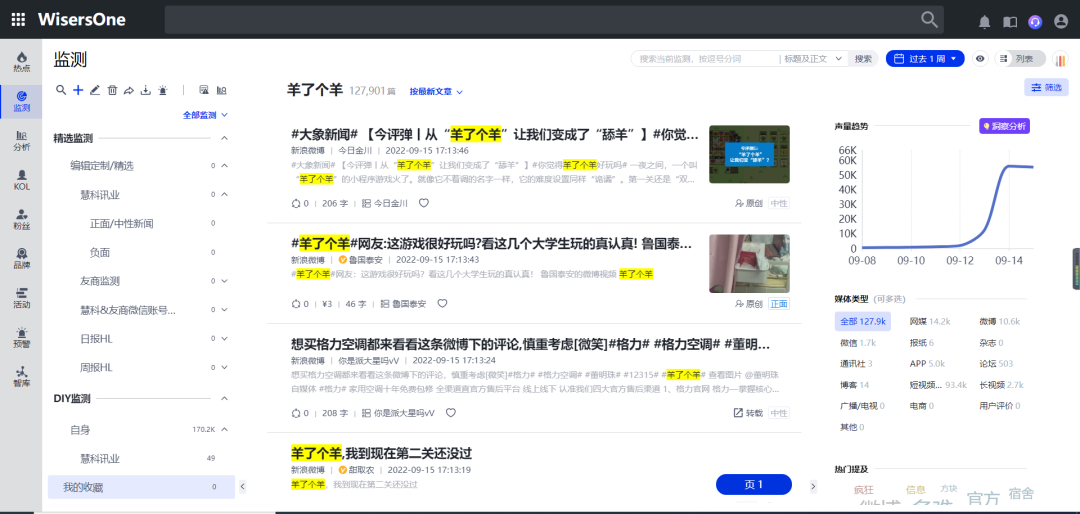 随着游戏热度持续疯涨,参与该游戏的人数越来越多,游戏服务器也曾一度崩溃,出现了登录异常等问题,关于该游戏的讨论热度也仍在持续。根据Wisers大数据平台显示,截止到9月15日13时,全网信息总量达127.9K。