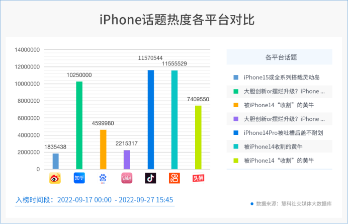 发布会后,数据统计从9月17日起至27日,仅10日iphone分别以不同话题出现在各个平台热搜榜,据数据统计,苹果不同的话题就拿到四个平台热搜榜第一,分别是“iphone或全系列搭载灵动岛”、“黄牛控诉iPhone倒贴100元出”、“iphone14 Pro被吐槽后盖不耐划”、“iPhone14收割的黄牛”。