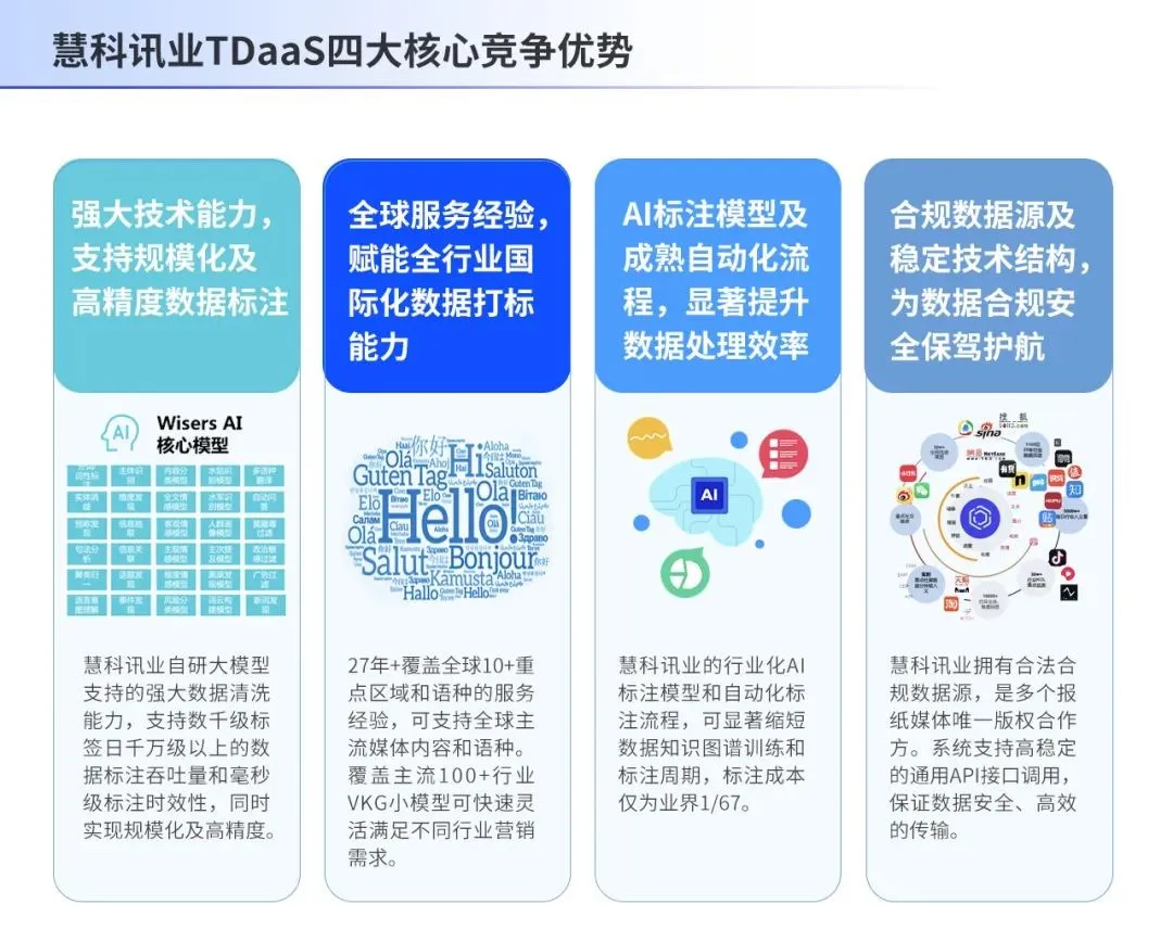 背靠拥有100+ AI及大数据专家的Wisers AI Lab,慧科讯业聚焦行业化大数据AI模型训练和标注,基于行业领先的数据源、深厚AI技术积累和丰富行业knowhow,为企业提供业界领先Training Data as a Service(TDaaS)服务。通过提供全球视野的数据标注,助力加速AI应用落地和业务智能化,赋能数据资产积累,构建独有竞争壁垒。