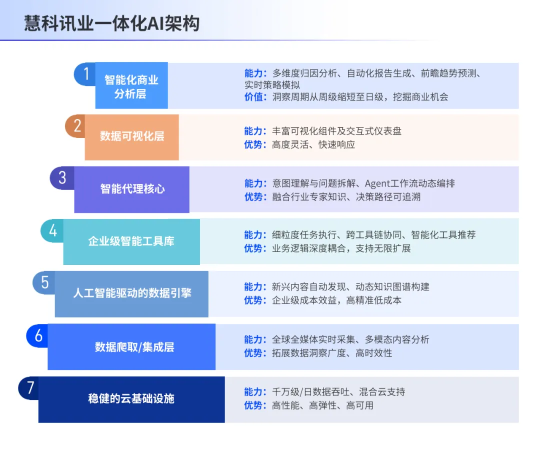 慧科讯业一体化AI架构,通过“多模态数据智能引擎 + Agent驱动的自动化工作流”,帮助企业理解并拆解复杂的商业分析需求,在速度、深度与可信度上重构商业洞察的生成逻辑。