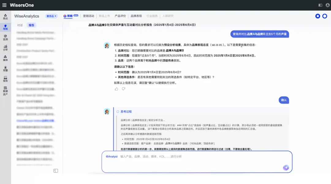 如针对某品牌的新品调研需求,慧科讯业一体化AI Agent在接收“分析某品牌用户口碑”指令后,会自动进行多个步骤,以生成深度洞察报告: