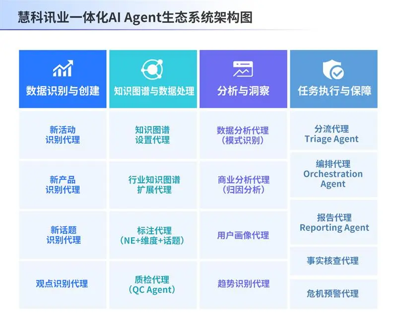 慧科讯业一体化AI Agent从数据识别创建、知识图谱建立处理、分析与洞察、任务执行与保障四大层面,针对整个业务流程全程把控,充分提效。