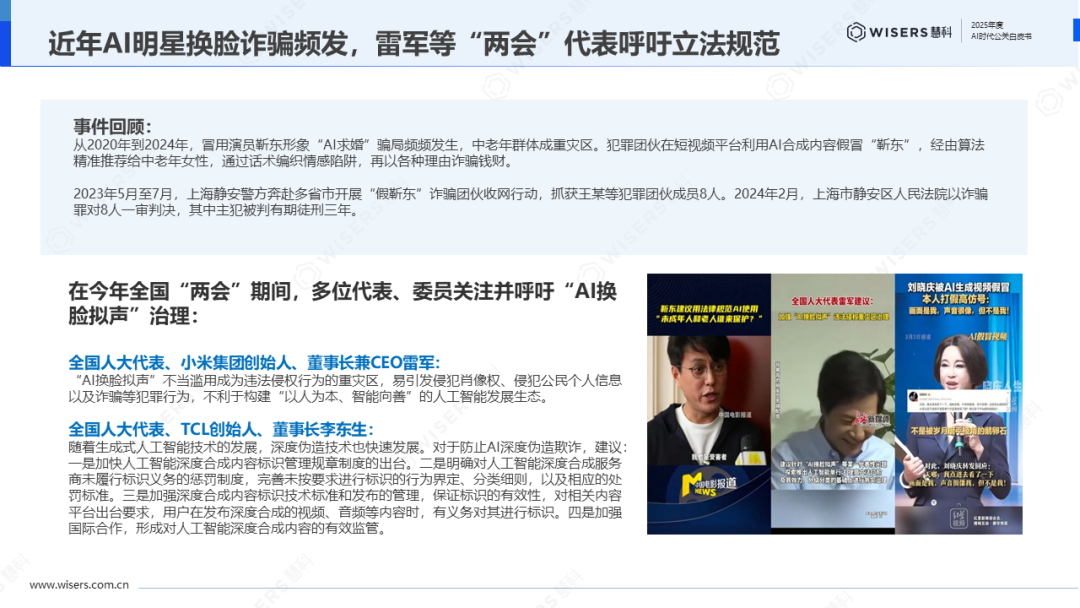 在今年全国 “两会” 期间,包含小米集团创始人雷军、TCL 创始人李东生在内的多位代表或委员关注并呼吁 “AI 换脸拟声” 治理,并建议加快立法进程,在安全与发展并重的基础上发展 AI 能力,强化行业自律共治,明确平台、企业等各方的责任和义务。