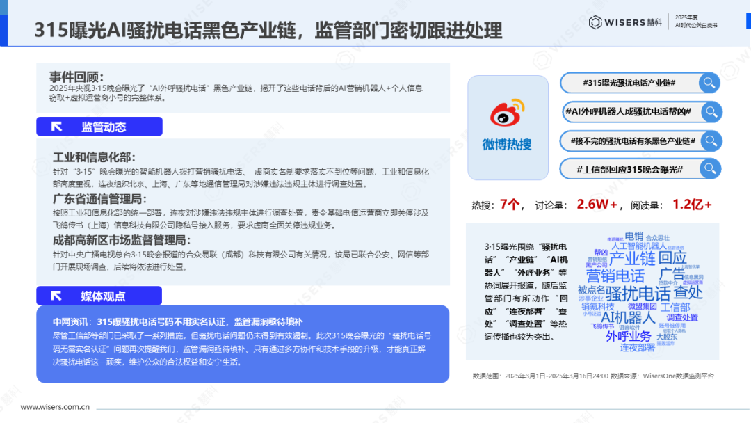 2025 年央视 3・15 晚会就曝光了 “AI 外呼骚扰电话” 黑色产业链,揭开了电话背后的 “AI 营销机器人 + 个人信息窃取 + 虚拟运营商小号” 的完整体系。针对 “3・15” 晚会曝光的智能机器人拨打营销骚扰电话、虚商实名制要求落实不到位等问题,监管部门立刻采取行动。工业和信息化部高度重视,连夜组织北京、上海、广东等地通信管理局对涉嫌违法违规主体进行调查处置。