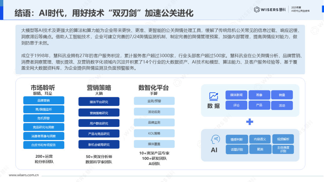 洞察到这一趋势,慧科讯业 Wisers 发布《2025 年 AI 时代公关白皮书》,在白皮书中对 2025 年 AI 相关代表性的公关事件进行回顾与总结,为企业理性应对 AI 相关事件提供参考。同时,揭示 AI 如何通过AI 大数据分析赋能危机公关从被动响应升级为主动洞察、精准决策、高效修复,并提供可落地的策略框架,帮助企业更好地把握危机处理的关键,转危机为契机。欢迎点击下图,申请完整版报告。
