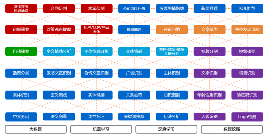 慧科讯业拥有多项自行研发的人工智能及自然语言处理技术 (见下图),包括实体识别、情感分析、话题分类、自动摘要、文章聚类去重、关系抽取等,并在此基础上,开发出一系列业务增强分析模型,为大量客户提供大数据智能分析服务。不少客户都是通过比对多家公司的技术能力及服务质量后才选择慧科作为服务供货商,可见慧科讯业的技术已经十分成熟。此外,慧科讯业具有庞大的专业标注团队,以及自己研发的数据标注工具,在保证标注准确率的同时,可以保证标注效率,能够快速为各种项目采集大量标注数据,以供训练机器学习模型之用,提高项目完成的效率。