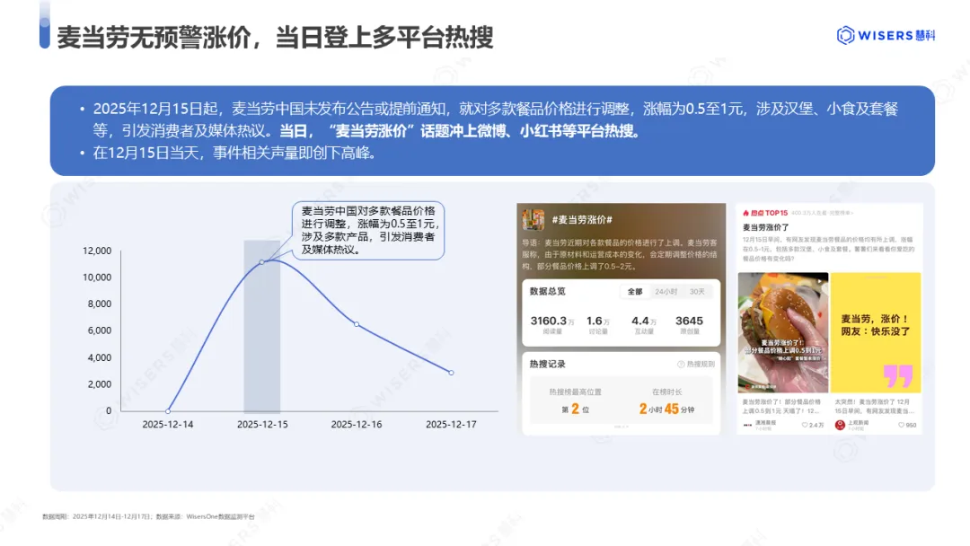 慧科讯业Wisers旗下的全球全媒体、全区域覆盖的舆情智能监测、管理和分析平台WisersOne显示,在12月15日当天,事件相关声量即创下高峰。“麦当劳涨价"话题也于12月15日当天在微博、小红书等社媒平台登上热搜榜。
