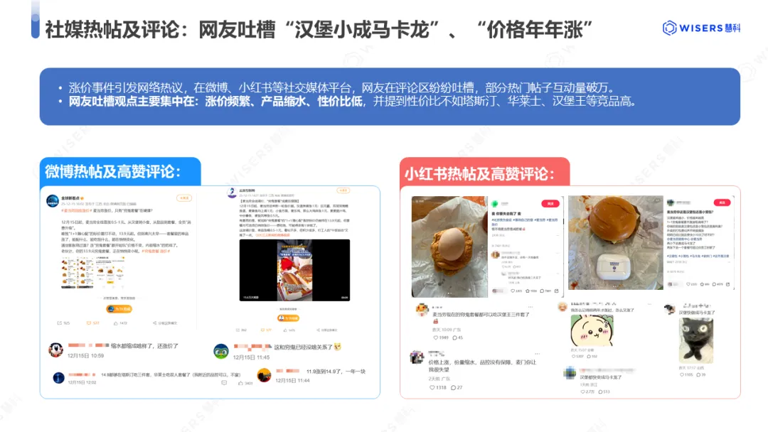 在社媒平台,麦当劳涨价行为引发网友不满,纷纷发帖及在评论区互动,三天内部分热门帖子互动量已破万。在微博及小红书平台,热帖及热门评论区网友观点主要集中在涨价频繁与产品缩水,部分高互动内容包括“汉堡快变成马卡龙了”、“缩水都缩成啥样了,还涨价了”。同时,网友也提到塔斯汀、华莱士、汉堡王等竞品,认为相比之下麦当劳性价比低。