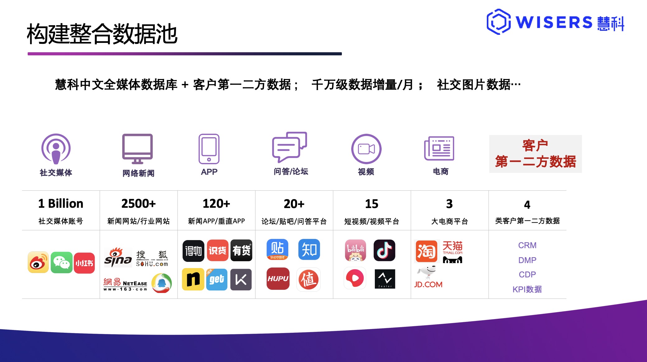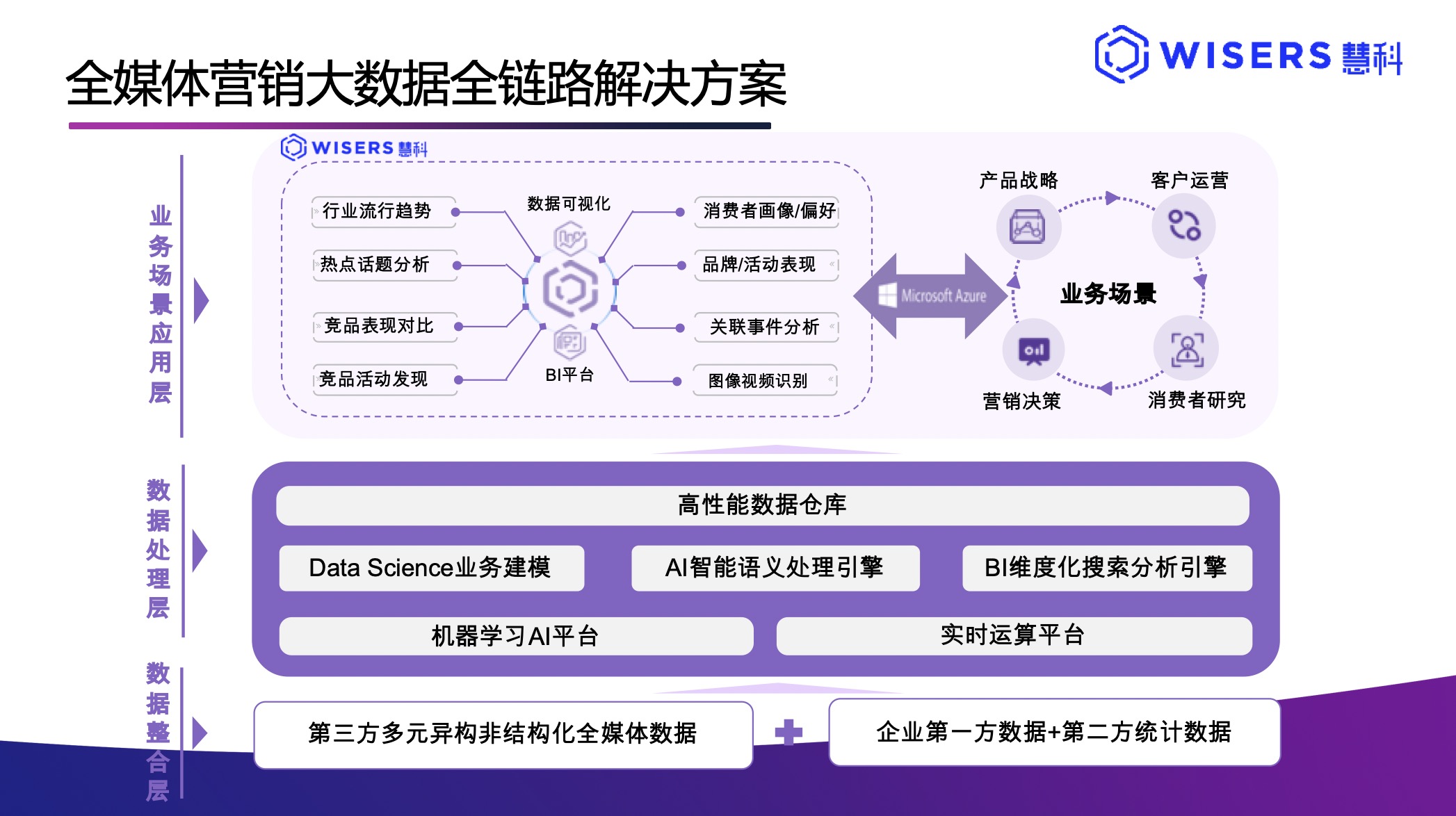如果以上这些属于业务场景应用层,而支撑这些大数据应用到业务决策上的,下面则要打“两层地基”。2019年,慧科讯业与该品牌合作后,提出了全媒体营销大数据全链路解决方案,最底层为数据整合层,包括第三方多源异构非结构化全媒体数据和企业第一方数据+第二方统计数据。中间一层为数据处理层,通过高性能数据仓库,以及机器学习AI平台和实时运算平台等,将数据处理成最顶层的可视化数据,最终,这些数据和分析为业务场景应用层提供了充实有效的依据。