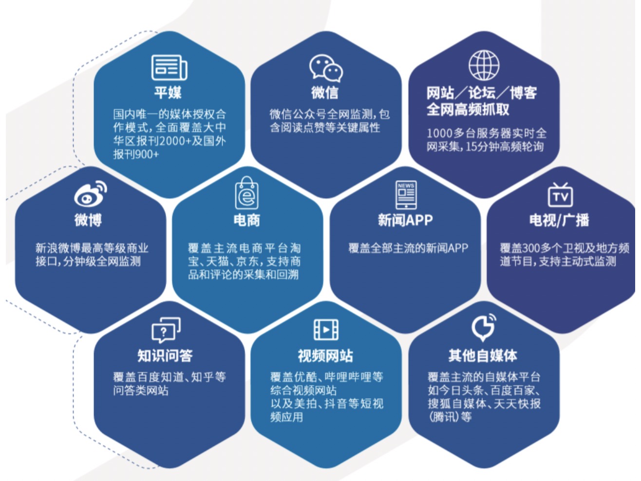 媒体全覆盖:随着移动互联网时代的到来,大众发声渠道和方式日益增多,纸媒、微博、微信、论坛、各类APP等都可能是舆情发酵地。为避免管中窥豹,以偏概全,全方位的媒体覆盖是企业科学决策的第一步。