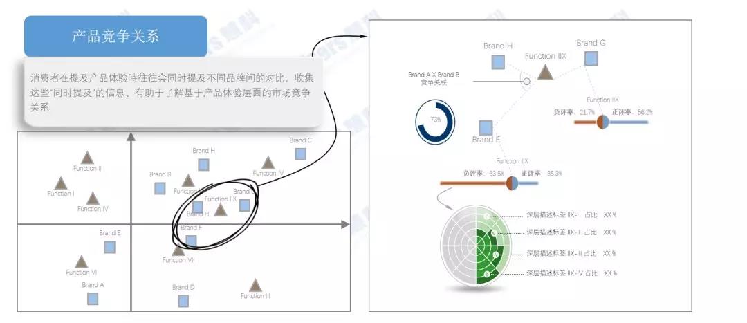 在竞品分析方面,行业知识图谱可助力品牌深度洞察产品竞争关系,消费者在提及产品体验時往往会同时提及不同品牌间的对比,收集这些“同时提及”的信息、有助于了解基于产品体验层面的市场竞争关系。