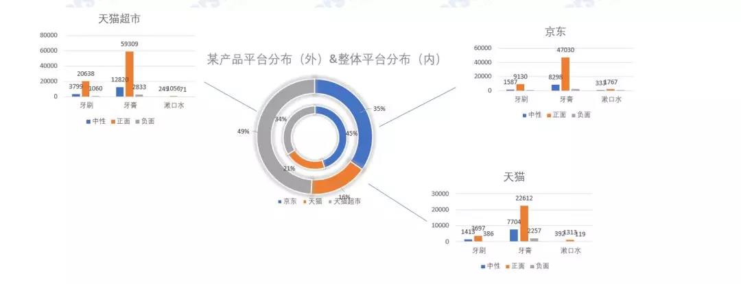 如下图案例所示,通过行业知识图谱技术可以分析出某品牌的牙膏、牙刷、漱口水三类产品在天猫、天猫超市、京东三个平台上,消费者评论中评论语句在中性、正面、负面情感上的分布。