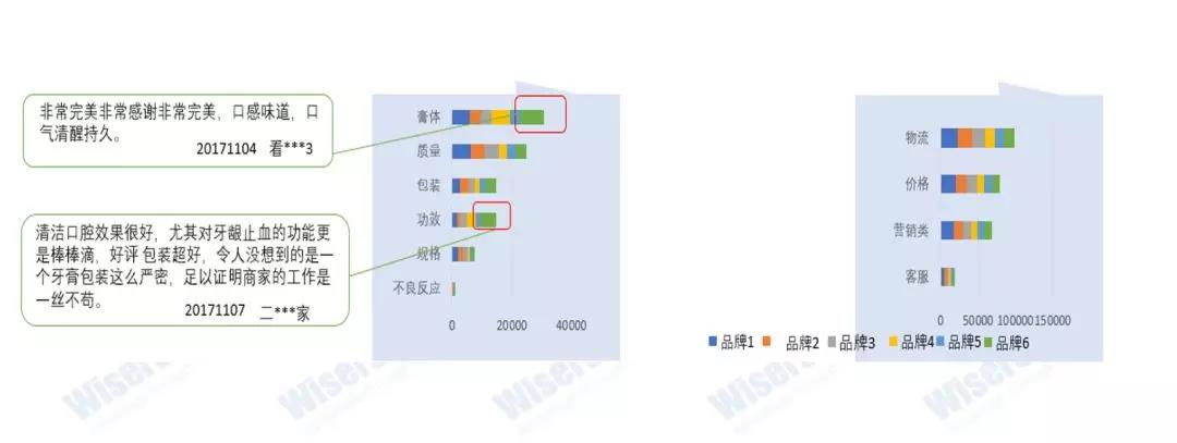 比如下图所示,对于不同品牌的牙膏,消费者在膏体、包装、质量、功效、规格、不良反应等方面的关注度和评价大不相同,同时对于不同品牌在物流、价格、营销、客服上的表现评价也各异。
