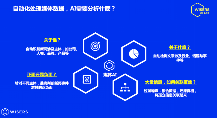 何超博士在演讲中提到,全媒体大数据中蕴含丰富的有价值信息,无论是宏观经济政策、国际贸易环境、国际政治形势、金融监管等话题;或是行业关注的议题,如行业动态、条例违规、融资融券、经营状况等;再或是具体到某种产品、某个维度的用户喜好与评价,通过自然语言处理等人工智能技术,都可以在第一时间充分发掘出来。进一步地结合“情感分析”和企业自身数据,通过业务预测模型,这些信息都可以转化并引领投资机构和企业先人一步,更全面更准确地把控宏观环境、了解投资市场与竞争对手、挖掘商机、管控风险,精准营销,从而实现投资回报率最大化。