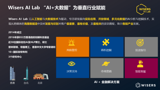 在这个信息碎片化的时代里,高效准确的处理金融行业相关的海量情报信息,能够减少不必要的时间、人力和财务成本消耗,同时提高所获取信息的相关性和及时性。Wisers AI Lab持续致力于为金融行业客户解决信息挖掘难题、优化输出信息质量,是信息化时代和全媒体文本环境中不可或缺的解决方案专家。基于以上场景化解决方案,Wisers AI Lab帮助客户全自动获取、分析与汇总数据,按照客户指定格式及频率24x7全天候不间断推送结构化金融情报数据,包括原始文章、话题标签、关键词、公司及发债主体、文章和主体级别的情感及得分、及各种汇总评价指标等,实现产品和服务的高可落地性。既保障了客户的商业需要,更提升了产品的客户满意度,而完全自主的技术,更摆脱了其它产品技术层面的局限性,使技术和产品的长足推广与优化成为可能。