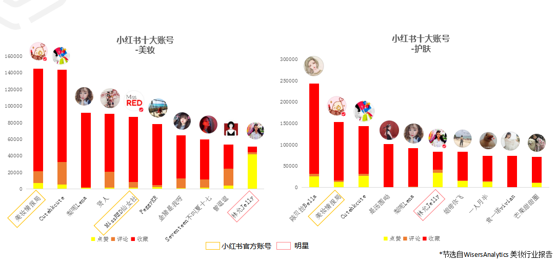 此外,从头部账号属性也可证明以上论断。WisersAnalytics对“美妆”和“护肤”两大内容板块进行分析、对比后发现,美妆与护肤头部账号以素人为主,这也进一步说明小红书的核心宝藏不在于明星KOL而在于素人。素人提供的美妆产品测评种草效果极佳。相比于明星的常规广告宣传,用户更相信和她们身份和经历更相近的“草根达人”,后者承载着她们“买到货真价实好物”的愿望。