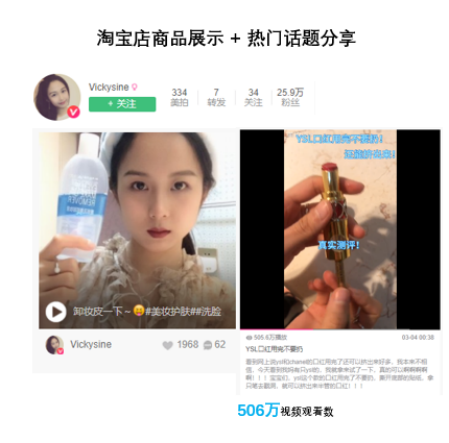 玩法一:美拍成了很多淘宝店主的引流入口。商家通过分享商品试用来增加曝光,虽然帖文中出现明显的淘宝商品链接,但从百万级的播放量来看,美拍用户似乎也并不在意这样的“硬推销”,这也契合了现在社交消费 (Social Commerce) 的趋势: