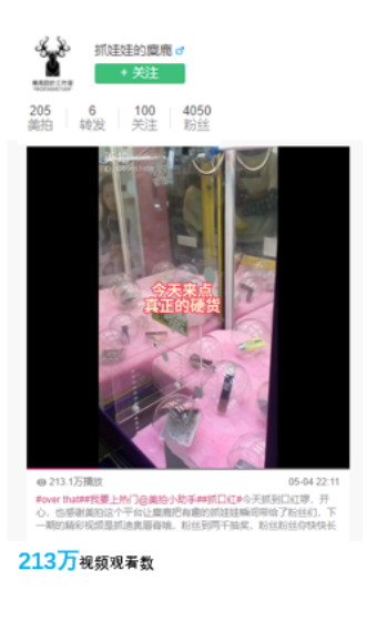 玩法二:美拍上刮起了一股“抓娃娃”风潮,各类五花八门的“专业抓娃娃”博主现在也开始抓起了大牌美妆,这种混搭的“猎奇感”成功吸引了美拍用户的兴趣。