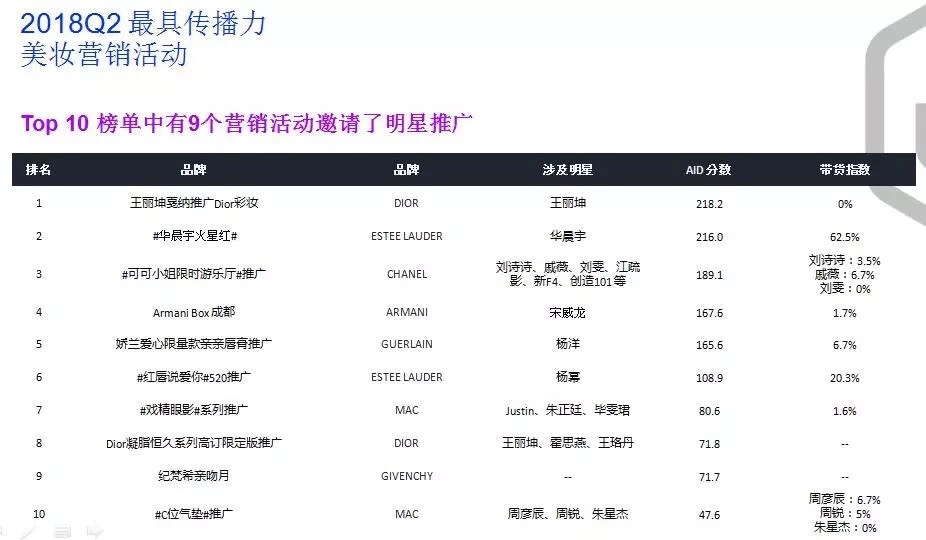 “在信息爆炸、时间碎片化的今天,‘品牌+明星+粉丝团’可以增加曝光与播放量,扩大活动知名度。”杨慧旋展示了基于慧科讯业大数据的“2018 Q2最具传播力美妆营销活动”,在排名前10的品牌营销活动中有9家都涉及了明星代言,其中华晨宇对#火星红#唇膏的带货指数甚至飙升到了63%。