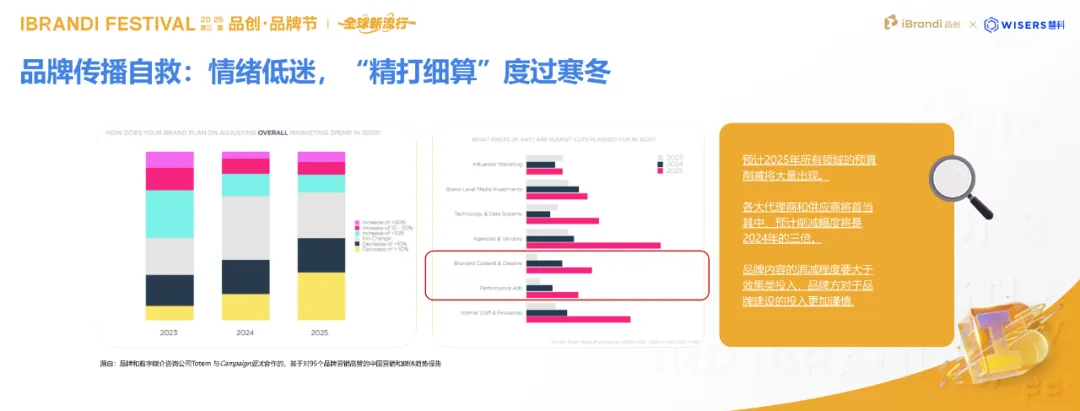 在这份第三方研究报告图表中,黄色部分代表那些品牌预算不断缩减的企业占比,从2023年到2025年,削减预算的企业数量在持续增加;而红色部分则代表在品牌建设方面增加预算的企业,但实际上这一比例在逐渐减少。
